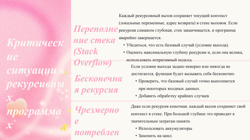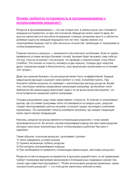 Почему требуется осторожность в программировании с использованием рекурсии?: Рекурсия в программировании — это как острый нож: в умелых руках она становится изящным инструментом, но при неосторожном обращении может нанести вред. Её красота заключается в способности выражать сложные алгоритмы про...